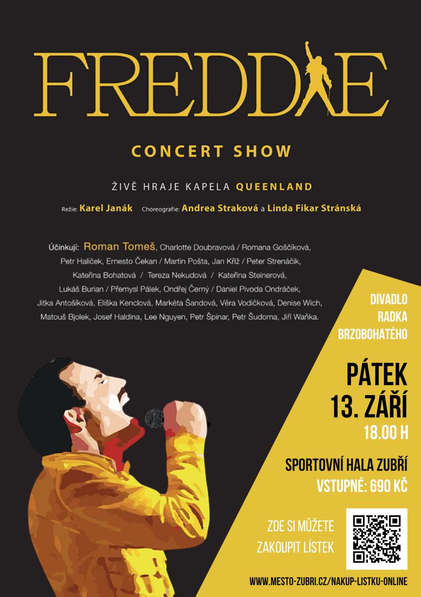 Freddie – Concert showV Divadle Radka Brzobohatého Hrají: Roman Tomeš / Filip Hořejš, Petr Halíček / Lukáš Burian, Ernesto Čekan / Martin Pošta, Jan Kříž / Peter Strenáčik, Kateřina Bohatová / Kateřina Steinerová, Přemysl Pálek / Lukáš Burian, Romana Goščíková / Charlotte Doubravová, Ondřej Černý / Daniel Pivoda Ondráček / Petr Šudoma / Jan Fanta termín představení: 4.12.2025 v 19 hodin 10.12.2025 v 19 hodin 30.12.2025 v 19 hodin |